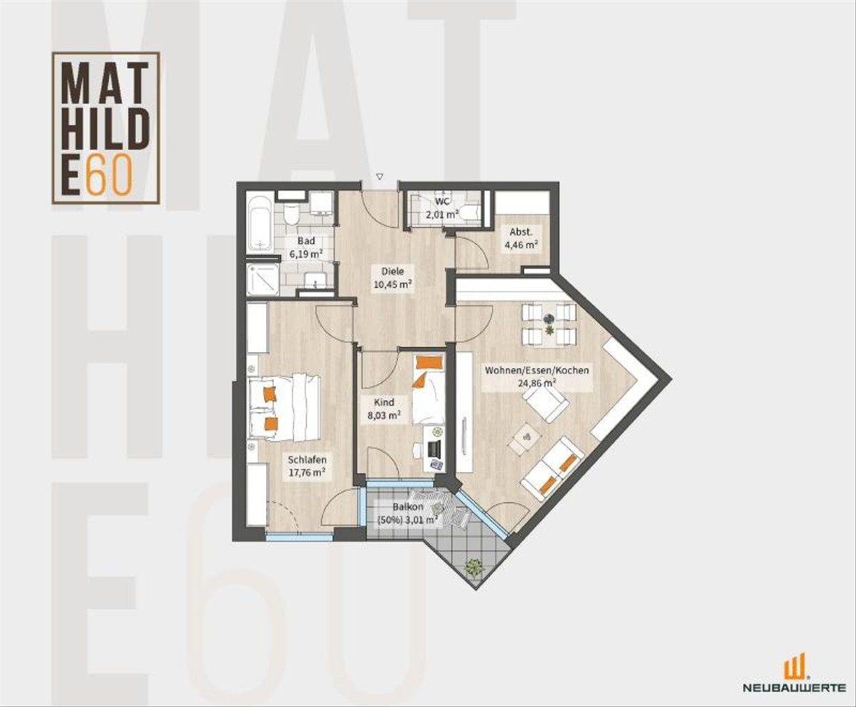Die ideale Kapitalanlage ist unkompliziert, attraktiv und individuell. MATHILDE60 bietet Ihnen genau das. Wählen Sie Ihre Wunschwohnung mit jeweils zwei bis drei Zimmern und 49 bis 85 m² Wohnfläche. Allesamt ausgestattet mit Balkon, Terrasse oder Wintergarten und auf Wunsch mit Stellplatz. Ein Invest mit NEUBAUWERTE ist ein zeitgemäßes Invest. Maßgeschneiderte Finanzierungskonzepte orientieren sich an Ihren Möglichkeiten. Und umfassende Standortanalysen und Verwaltungsservices lassen Sie sicher und vorausschauend planen und managen.