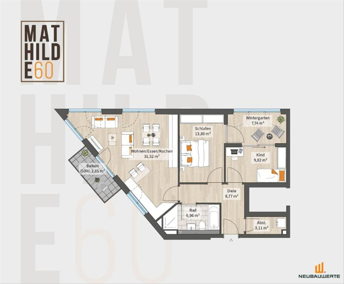Die ideale Kapitalanlage ist unkompliziert, attraktiv und individuell. MATHILDE60 bietet Ihnen genau das. Wählen Sie Ihre Wunschwohnung mit jeweils zwei bis drei Zimmern und 49 bis 85 m² Wohnfläche. Allesamt ausgestattet mit Balkon, Terrasse oder Wintergarten und auf Wunsch mit Stellplatz. Ein Invest mit NEUBAUWERTE ist ein zeitgemäßes Invest. Maßgeschneiderte Finanzierungskonzepte orientieren sich an Ihren Möglichkeiten. Und umfassende Standortanalysen und Verwaltungsservices lassen Sie sicher und vorausschauend planen und managen.