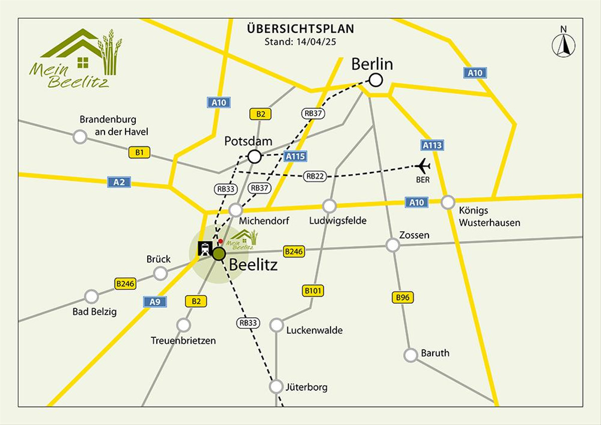 - Nur 250 m bis zum Regionalbahnhof Beelitz mit direkter Bahnverbindung nach Potsdam und Berlin sowie mit einmaligem Umsteigen zum Flughafen BER