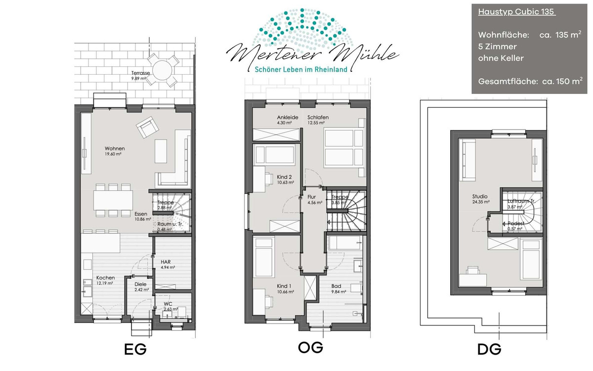 Der Haustyp Cubic 135 überzeugt durch fünf Zimmer, verteilt auf insgesamt drei Ebenen, mit genug Platz für die vier- bis fünfköpfige Familie.