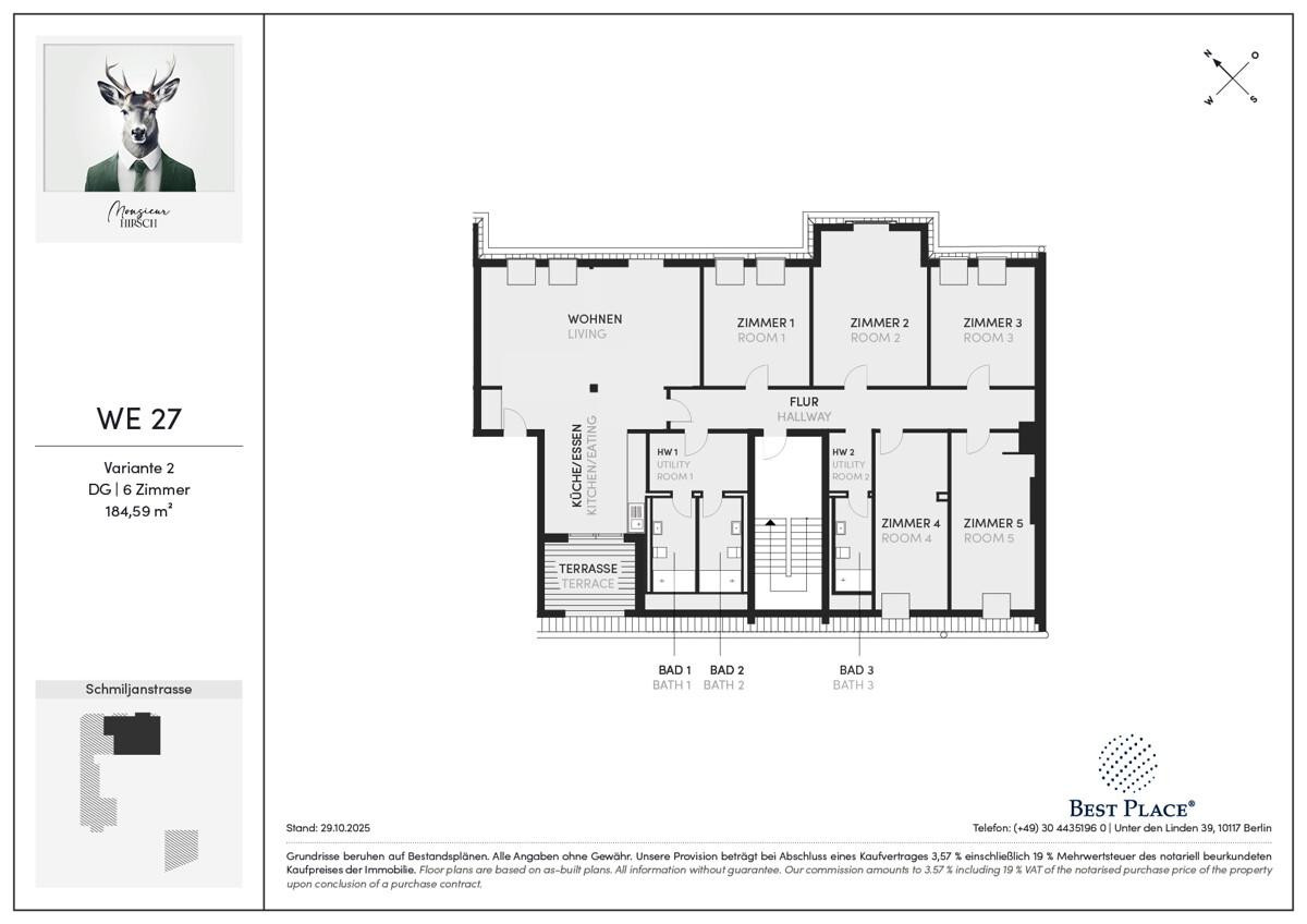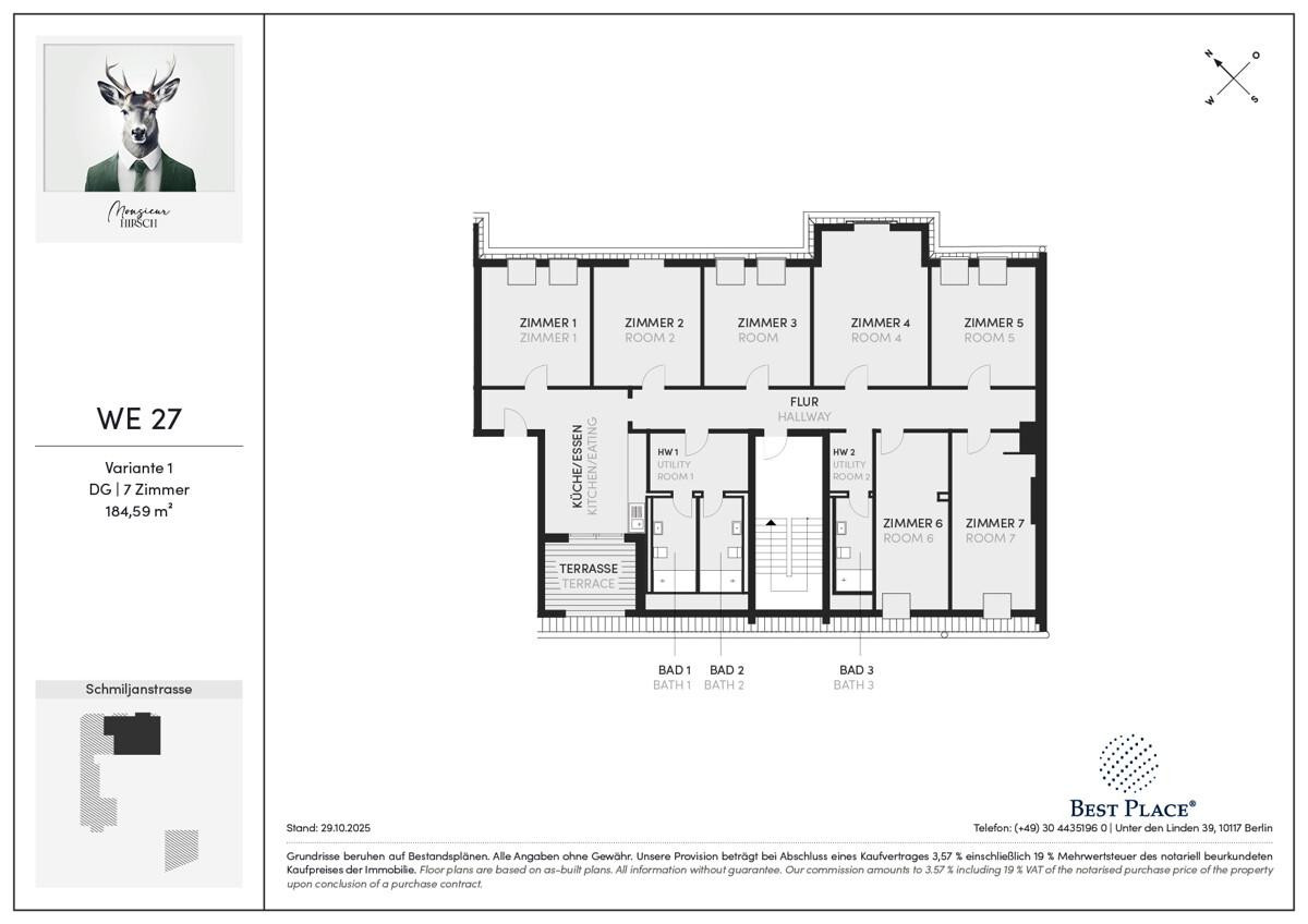 Monsieur Hirsch ist ein elegantes Gründerzeit-Ensemble mit Baujahr 1900, auf das ein Neubau-Dachgeschoss aufgesetzt wurde. Es liegt im schönen und idyllischen Friedenau im Bezirk Tempelhof-Schönberg, der zwei Hirsche in seinem Wappen führt. Die in Braun und Grün gehaltene Klinkerfassade erinnert außerdem an die Bewohner des Waldes, der mit dem Grunewald ganz in der Nähe liegt. Im Zuge des Dachgeschoss-Neubaus werden die Fassade und die Treppenhäuser renoviert und erstrahlen schon bald in neuem Glanz.