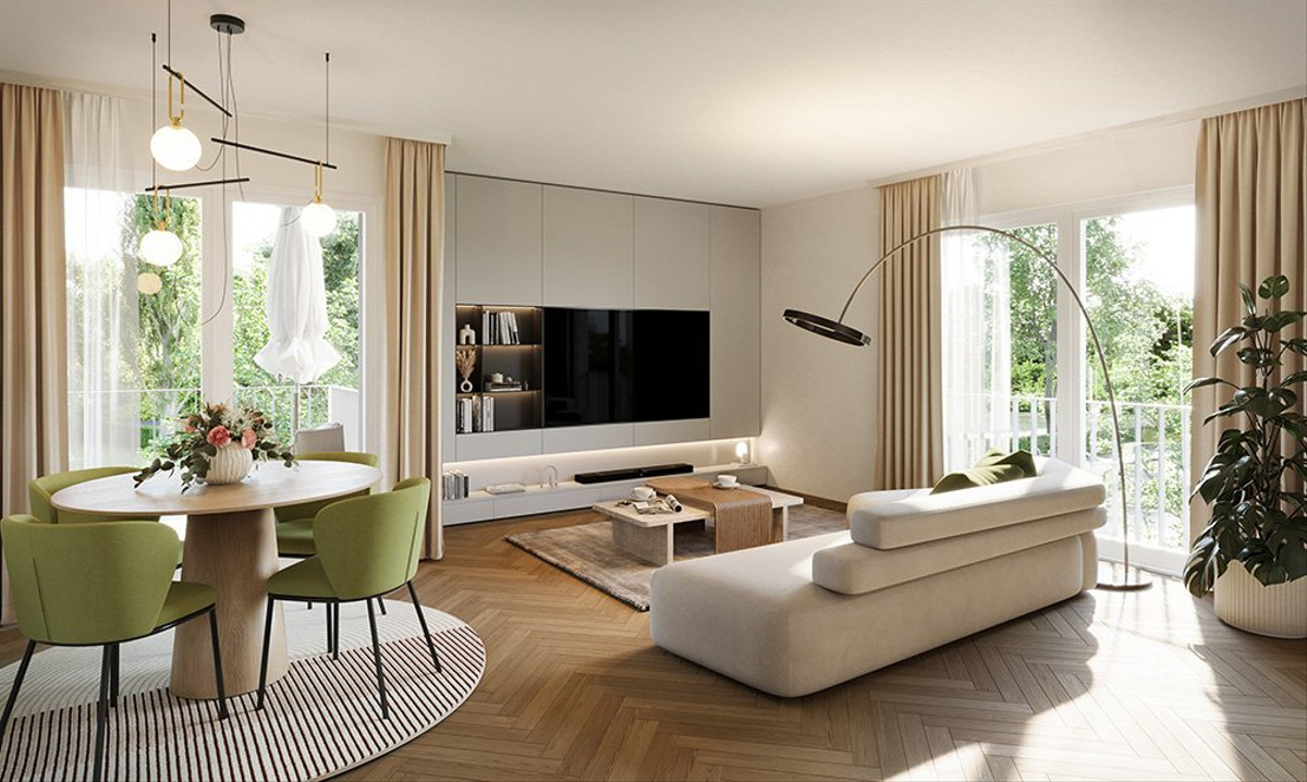 Alle Wohnräume verfügen über bodentiefe Fenster, die für ein helles und lichtdurchflutetes Ambiente sorgen.