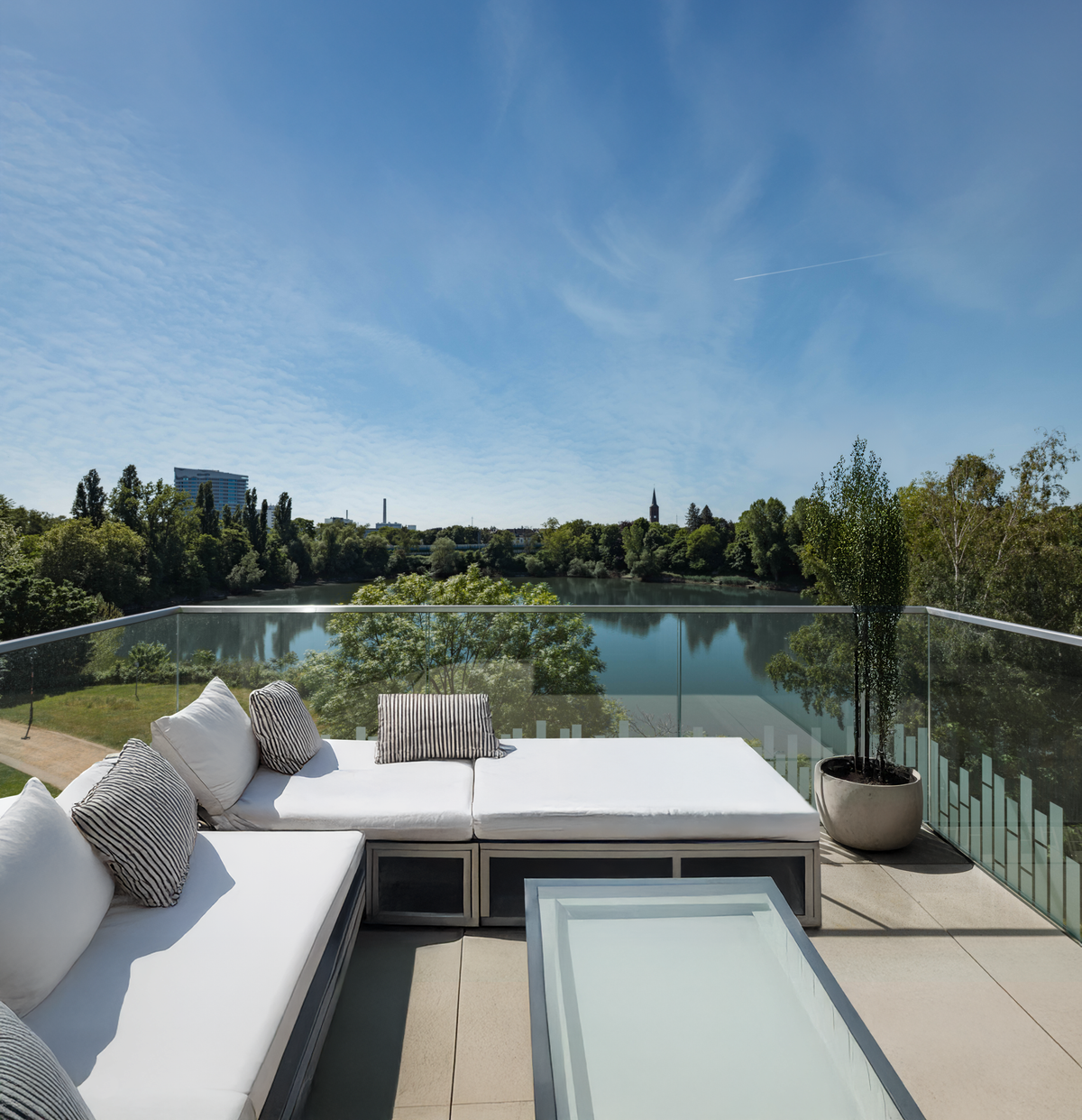 Eine Oase in der Stadt: Die von HPP Architekten gestalteten Häuser bilden einen baulichen Rahmen für das Wohnquartier. Sie schaffen einen geschützten Wohn- und Freiraum und öffnen sich Richtung See. Geometrische Formen, gerade Linien und bodentiefer Fenster versprechen schon von außen mehr als eine Mischung zwischen Form und Funktion: Das ist PANDION ALBERTUSSEE by HPP Architekten.