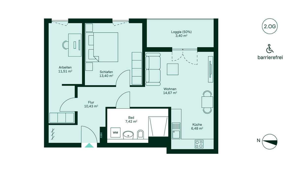 Ein Ort zum Zurückziehen und Wohlfühlen. Diese barrierefreie Eigentumswohnung im zweiten Obergeschoss bietet Ihnen ein ruhiges Zuhause mit durchdachter Raumaufteilung. Bequem erreichen Sie Ihre Wohnung über einen Aufzug. Der Eingangsbereich führt Sie in den großzügigen Wohnraum, der durch eine Loggia ergänzt wird und sich vielseitig nutzen lässt. Die offene Wohnküche schafft Raum für gemeinsames Kochen. Zwei weitere Zimmer eignen sich ideal als Schlaf- oder Arbeitsbereich. Das Badezimmer ist mit einer bodengleichen Dusche und einer Duschtrennwand ausgestattet und bietet alltäglichen Komfort. Die gesamte Wohnung ist barrierefrei gestaltet und mit einer Fußbodenheizung ausgestattet, die in allen Räumen für angenehme Wärme sorgt.