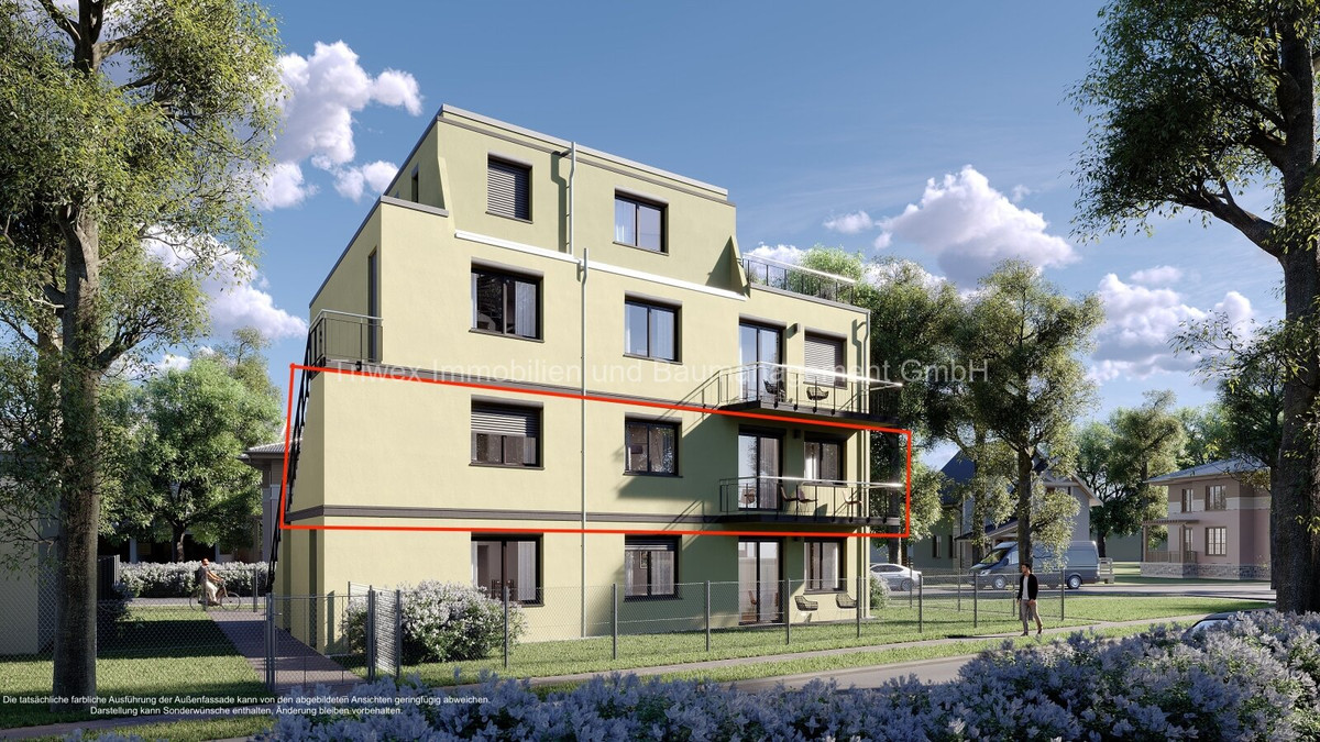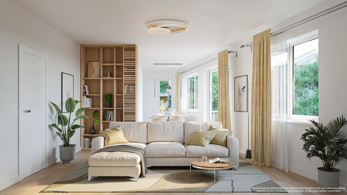 Die Fenster sind in Kunstofffenster ausgeführt und haben eine hochwertige Schallschutz-Dreifachverglasung. An der Südfassade werden die Fenster bodentief ausgeführt und haben eine Fenstertür zum Austritt auf die äußerst großzügige Südterrasse mit ca. 9qm.