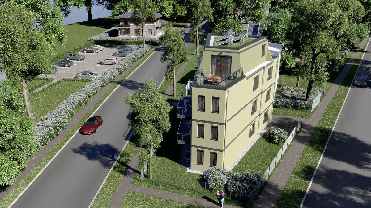 Durch die schon fast Trichterförmige Bauart des Gebäudes, zeigt sich ein morgendliches Sonnenspektakel, bereits in den Morgenstunden. Auf der Südfassade in Seerichtung und der eigenen Terrasse kann der Sonnenaufgang in vollsten Zügen betrachtet werden.