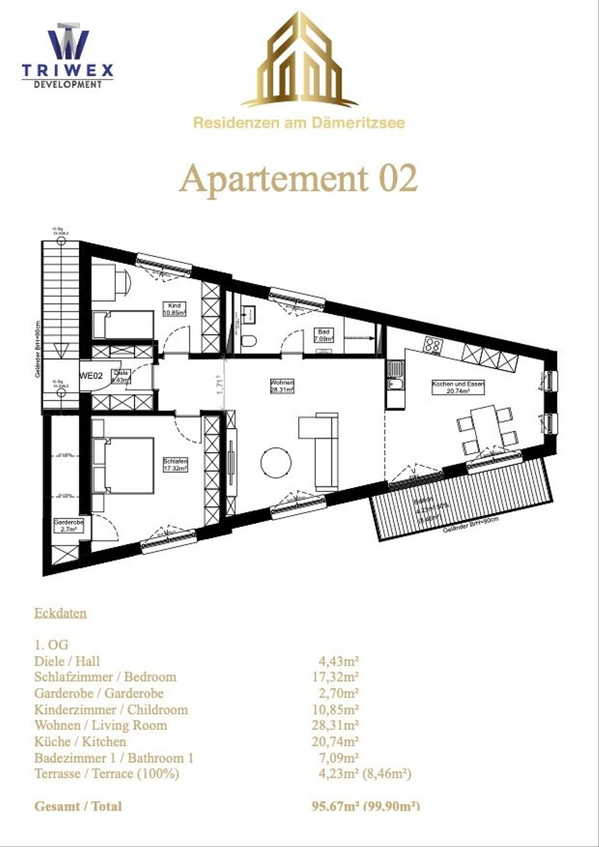Das vorgestellte Objekt zum Verkauf ist eine Etagenwohnung im 1. OG mit 3 Zimmern und ca. 95qm aus einem Neubauprojekt direkt gebaut am Dämeritzsee. Von der Terrasse aus, ergibt sich durch die bodentiefen Fenster ein atemberaubender Blick auf den See.