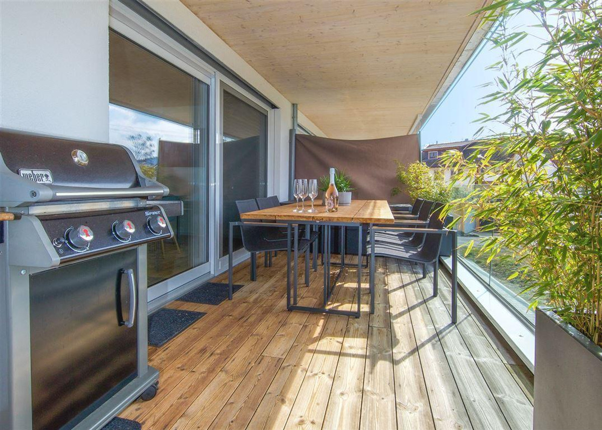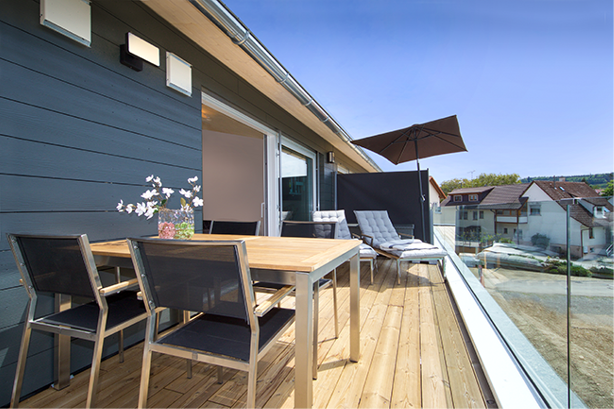 Zu jeder Wohnung gehört eine großzügige Terrasse oder Balkon. Welche Wahlweise mit einem hölzernem Schiebeladen ausgestattet werden können.