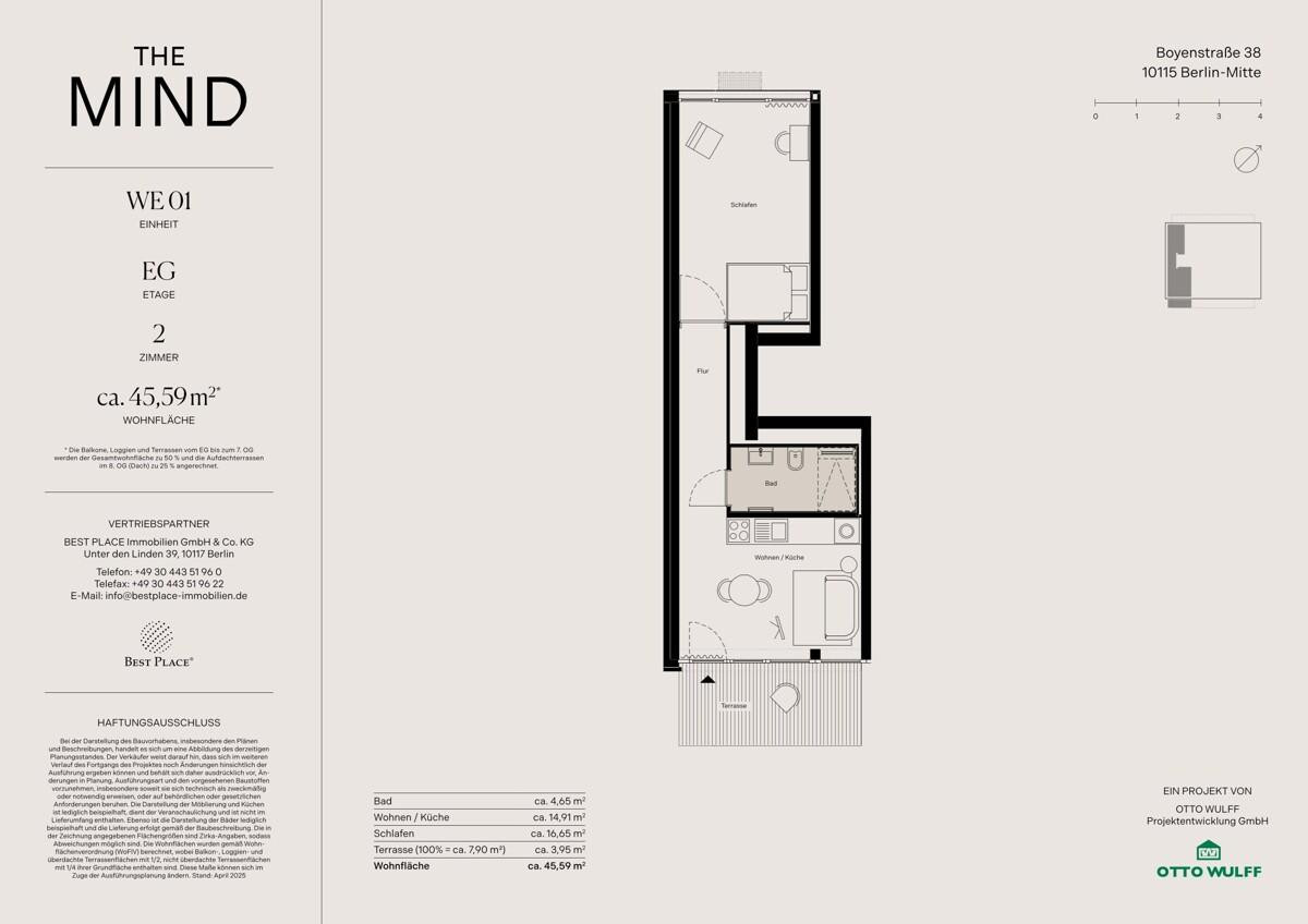 Auf dem letzten unbebauten Grundstück an der Boyenstraße in Berlin-Mitte entsteht mit THE MIND ein edel schimmerndes Architektur-Highlight, welches ein exklusives Ambiente mit innovativer Gebäudetechnik, digitalen Features für die Bewohner und Nachhaltigkeit verbindet. Die Standards wie Fußbodenheizung, Eichen-Parkett und Handtuchheizkörper werden ergänzt von attraktiven Raumhöhen von bis zu ca. 2,96 m, eleganten, bodentiefen Aluminiumfenstern mit Sonnenschutz, kontrollierter Wohnraumlüftung über eine zentrale Abluftanlage, Balkonen und Terrassen sowie dem gärtnerisch gestalteten Gemeinschaftsgarten mit Hochbeeten, Apfelbäumen und Sitzgelegenheiten – eine grüne Oase mitten in der Stadt. Darüber hinaus sorgen der Personenaufzug, ein Waschmaschinenraum im Untergeschoss und ein digitaler Concierge für Komfort im Alltag. Ob Selbstnutzer oder Kapitalanleger, THE MIND ist ein absolutes Unikat in Berlin mit hervorragender Wertperspektive.