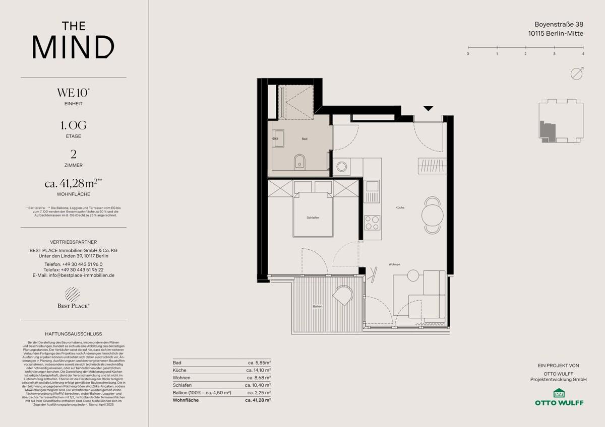Auf dem letzten unbebauten Grundstück an der Boyenstraße in Berlin-Mitte entsteht mit THE MIND ein edel schimmerndes Architektur-Highlight, welches ein exklusives Ambiente mit innovativer Gebäudetechnik, digitalen Features für die Bewohner und Nachhaltigkeit verbindet. Die Standards wie Fußbodenheizung, Eichen-Parkett und Handtuchheizkörper werden ergänzt von attraktiven Raumhöhen von bis zu ca. 2,96 m, eleganten, bodentiefen Aluminiumfenstern mit Sonnenschutz, kontrollierter Wohnraumlüftung über eine zentrale Abluftanlage, Balkonen und Terrassen sowie dem gärtnerisch gestalteten Gemeinschaftsgarten mit Hochbeeten, Apfelbäumen und Sitzgelegenheiten – eine grüne Oase mitten in der Stadt. Darüber hinaus sorgen der Personenaufzug, ein Waschmaschinenraum im Untergeschoss und ein digitaler Concierge für Komfort im Alltag. Ob Selbstnutzer oder Kapitalanleger, THE MIND ist ein absolutes Unikat in Berlin mit hervorragender Wertperspektive.