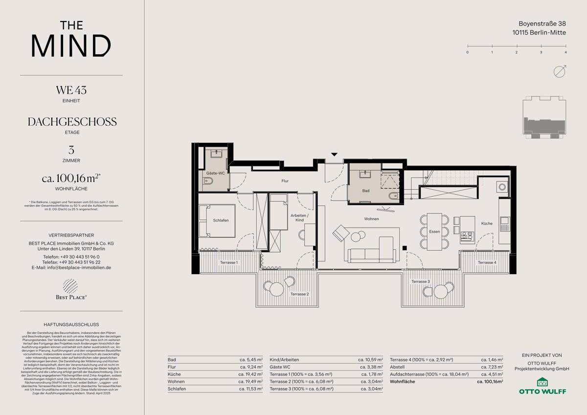 Auf dem letzten unbebauten Grundstück an der Boyenstraße in Berlin-Mitte entsteht mit THE MIND ein edel schimmerndes Architektur-Highlight, welches ein exklusives Ambiente mit innovativer Gebäudetechnik, digitalen Features für die Bewohner und Nachhaltigkeit verbindet. Die Standards wie Fußbodenheizung, Eichen-Parkett und Handtuchheizkörper werden ergänzt von attraktiven Raumhöhen von bis zu ca. 2,96 m, eleganten, bodentiefen Aluminiumfenstern mit Sonnenschutz, kontrollierter Wohnraumlüftung über eine zentrale Abluftanlage, Balkonen und Terrassen sowie dem gärtnerisch gestalteten Gemeinschaftsgarten mit Hochbeeten, Apfelbäumen und Sitzgelegenheiten – eine grüne Oase mitten in der Stadt. Darüber hinaus sorgen der Personenaufzug, ein Waschmaschinenraum im Untergeschoss und ein digitaler Concierge für Komfort im Alltag. Ob Selbstnutzer oder Kapitalanleger, THE MIND ist ein absolutes Unikat in Berlin mit hervorragender Wertperspektive.