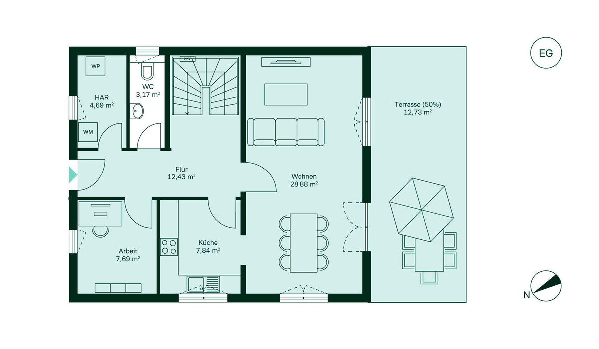 Willkommen in Ihrem neuen Zuhause, einem Einfamilienhaus mit zwei Vollgeschossen. Der Eingangsbereich führt Sie in ein großzügiges Wohnzimmer, das direkt an eine gepflasterte Gartenterrasse anschließt – perfekt für gesellige Stunden im Freien. Die Küche lädt zu kulinarischen Abenteuern ein und bietet ausreichend Platz für gemeinsame Mahlzeiten. Ein Arbeitszimmer ermöglicht produktives Arbeiten von zu Hause. Neben zwei Kinder-/Arbeitszimmern ist das Hauptschlafzimmer mit einer Ankleide ausgestattet, die für Ordnung sorgt. Ein Gäste-WC sowie ein Familienbad samt Dusche und Badewanne sorgen für zusätzlichen Komfort. Auch zwei Stellplätze stehen Ihnen zur Verfügung.