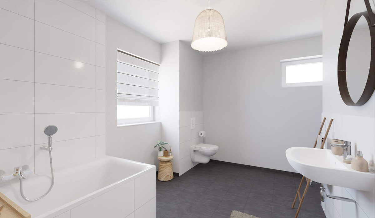 Willkommen in Ihrem neuen Einfamilienhaus. Die Diele führt Sie direkt in die offene Wohnküche, die viel Platz für gemeinsame Kochabende bietet. Im Wohnbereich können Sie gemütliche Stunden verbringen. Vom Wohnzimmer aus gelangen Sie auf die gepflasterte Terrasse mit Blick in den Garten – perfekt für entspannte Grillabende. Ein weiteres Zimmer auf dieser Ebene sowie das Gäste-WC sind praktisch bei Besuch, während der Hauswirtschaftsraum für Ordnung sorgt. Im Obergeschoss warten drei Zimmer und das Familienbad mit Badewanne und Dusche. Zwei Stellplätze bieten Komfort für Ihre Fahrzeuge und runden das Angebot ab.