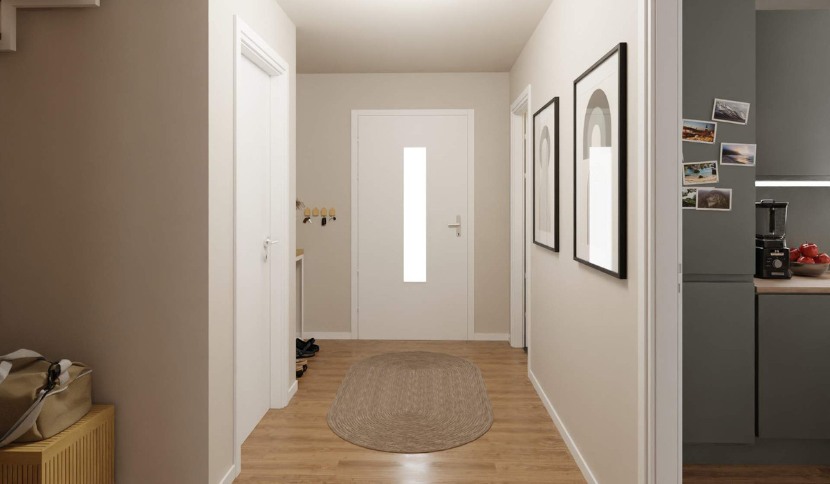 Willkommen in Ihrem neuen Zuhause. Der Eingangsbereich führt Sie direkt zur praktischen Küche, die nahtlos in den Wohnbereich übergeht. Hier können Sie entspannen oder Gäste empfangen. Der Zugang zur Terrasse bietet einen idealen Ort für Sommerabende mit Blick in den Garten. Ein zusätzliches Zimmer auf dieser Ebene eignet sich hervorragend als Büro oder Gästezimmer. Das Gäste-WC ist ideal für Besucher und der Hauswirtschaftsraum bietet zusätzlichen Stauraum. Im Obergeschoss warten drei Schlafzimmer sowie das große Familienbad mit Badewanne und Dusche. Zwei Stellplätze runden das Angebot ab.