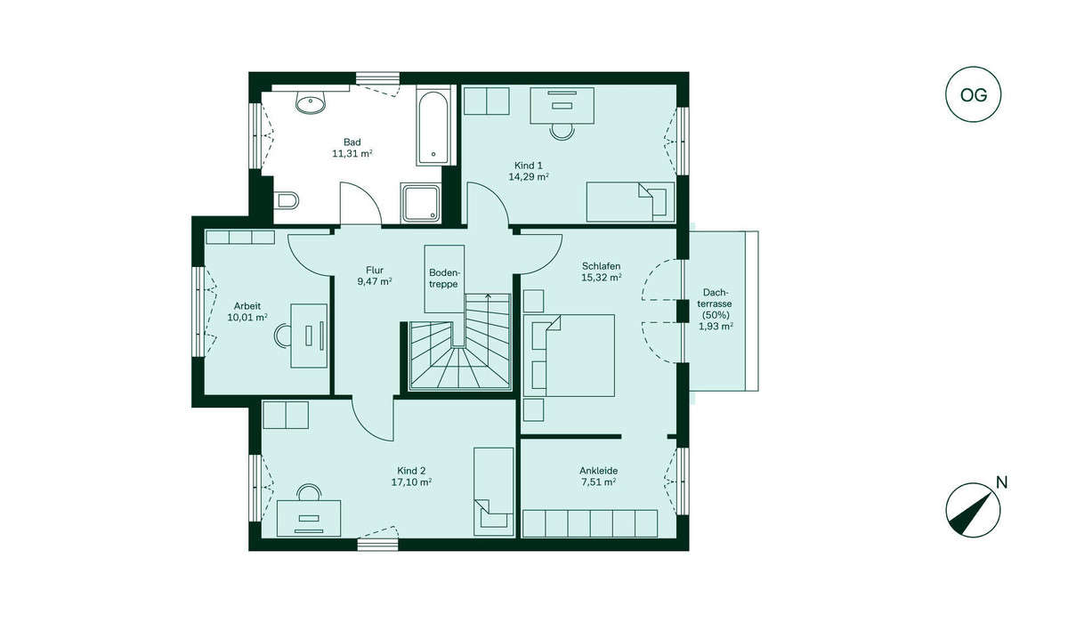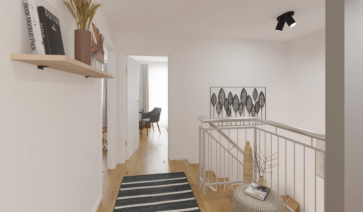 Herzlich willkommen in Ihrem neuen Zuhause. Die großzügige Küche lädt zum gemeinsamen Kochen ein. Das Wohnzimmer bietet Raum für gemütliche Stunden und öffnet sich zur Terrasse. Ein Gästezimmer und ein Hauswirtschaftsraum ergänzen das Erdgeschoss. Im Obergeschoss erwartet Sie ein Schlafzimmer mit Ankleide, perfekt für Ihre Garderobe. Zusätzlich genießen Sie von hier aus die Dachterrasse als Rückzugsort. Drei weitere Zimmer bieten Platz für Kinder oder Büro und insgesamt zwei Badezimmer sorgen für Komfort im Familienalltag. Zwei Stellplätze runden das Angebot ab.