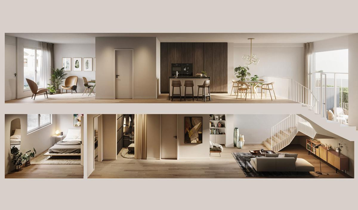 Diese Maisonette-Wohnung ist ein selten noch verfügbares Wohnerlebnis mitten im urbanen Neuhausen: Im ruhigen Hofhaus von VINZENT ist sie das Haus im Haus. Mit eigenem privatem Eingang und auf zwei Etagen konzipiert. Wohnen, Kochen und Essen gehen fließend ineinander über. Der Schlafbereich mit Ankleide und Bad ist entspannter Rückzugsort. Ein Arbeitszimmer bietet Raum für Kreativität. Eines der Highlights ist die fast über beide Stockwerke reichende Galerieverglasung. Von hier aus erreicht man die private Terrasse, die sich zum grünen Innenhof orientiert.