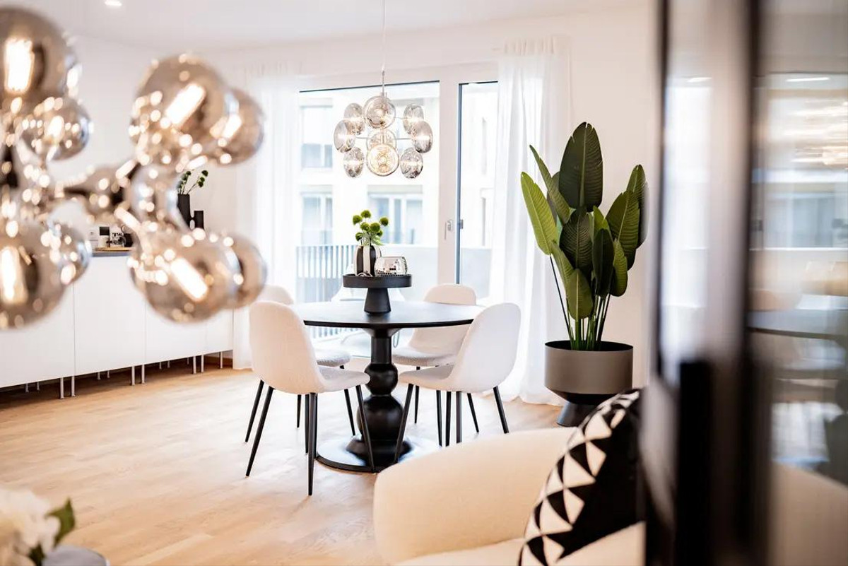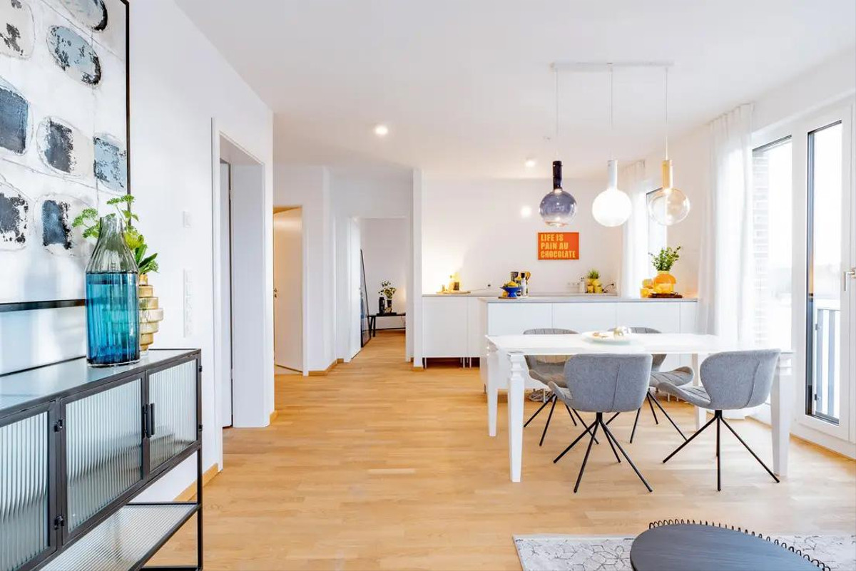 Helle Wohn- und Essbereiche mit offener Küche bilden jeweils das Zentrum der Wohnungen. Große Fensterflächen, Raumhöhen bis zu 2,70 m und der Zugang zu Balkon, Loggia oder Garten sorgen für ein angenehmes Raumgefühl mit viel Licht und Weite.