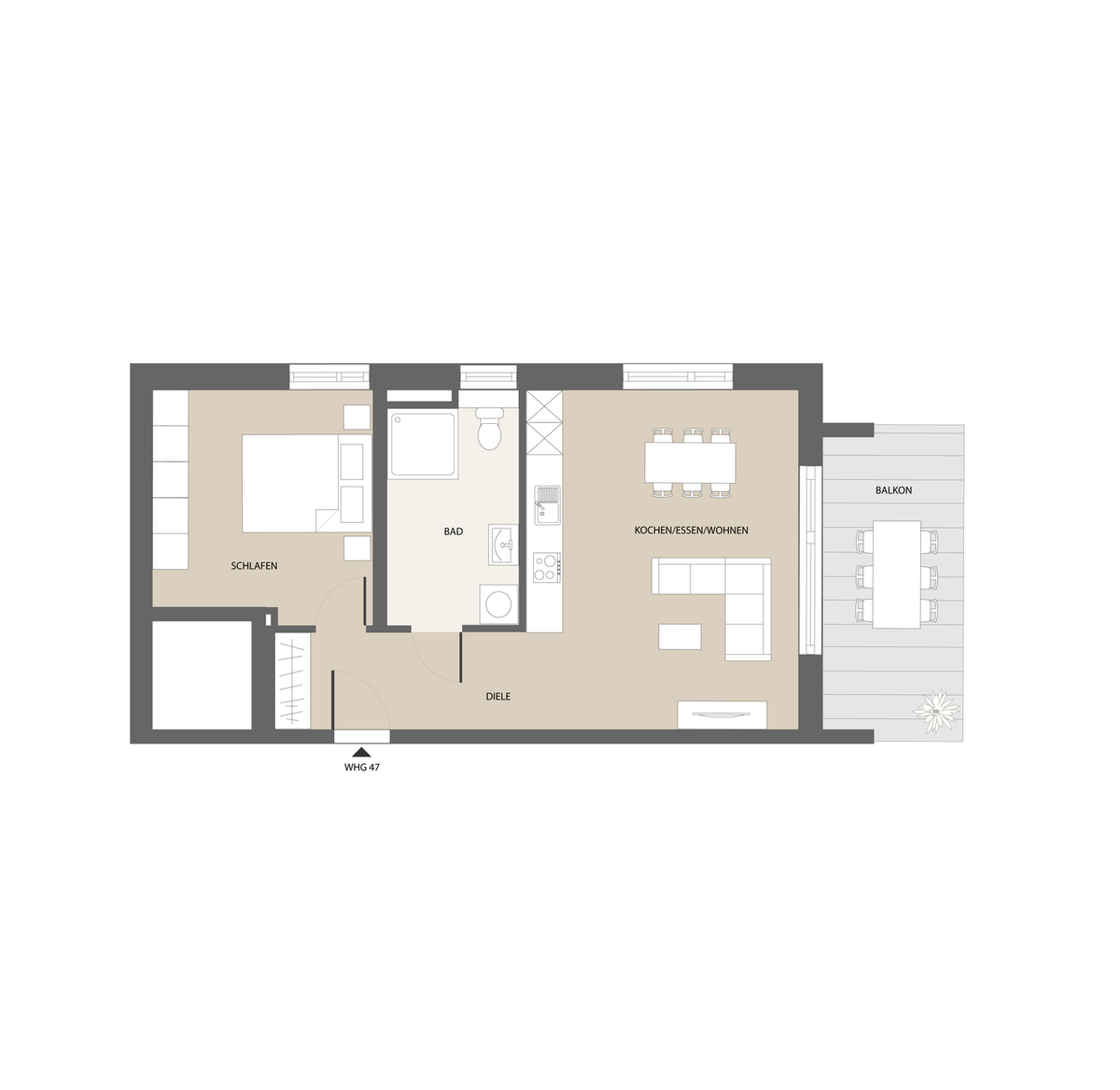 Der offen gestaltete Wohn- und Kochbereich bildet das Zentrum der Wohnung und öffnet sich über große Fensterflächen direkt zum nach Süden ausgerichteten Balkon. Dadurch entsteht ein helles, lichtdurchflutetes Wohngefühl mit hoher Aufenthaltsqualität.