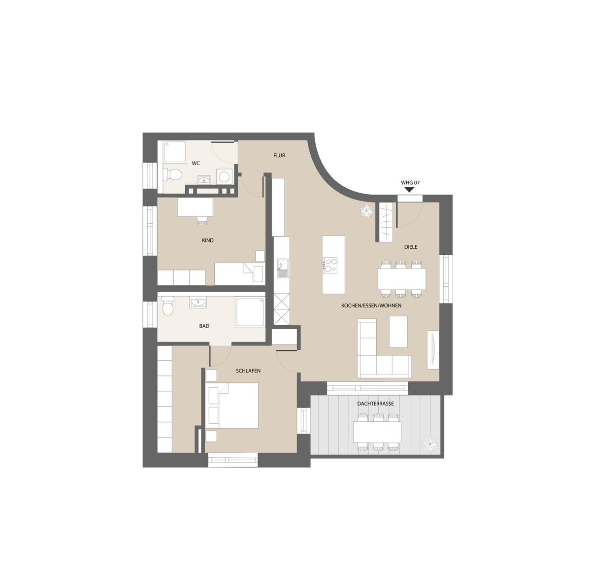 Das Penthouse überzeugt durch seine großzügige, blickgeschützte Dachterrasse mit Südwest-Ausrichtung, die einen schönen Überblick über das Quartier bietet und ideale Sonnenverhältnisse bis in die Abendstunden schafft.