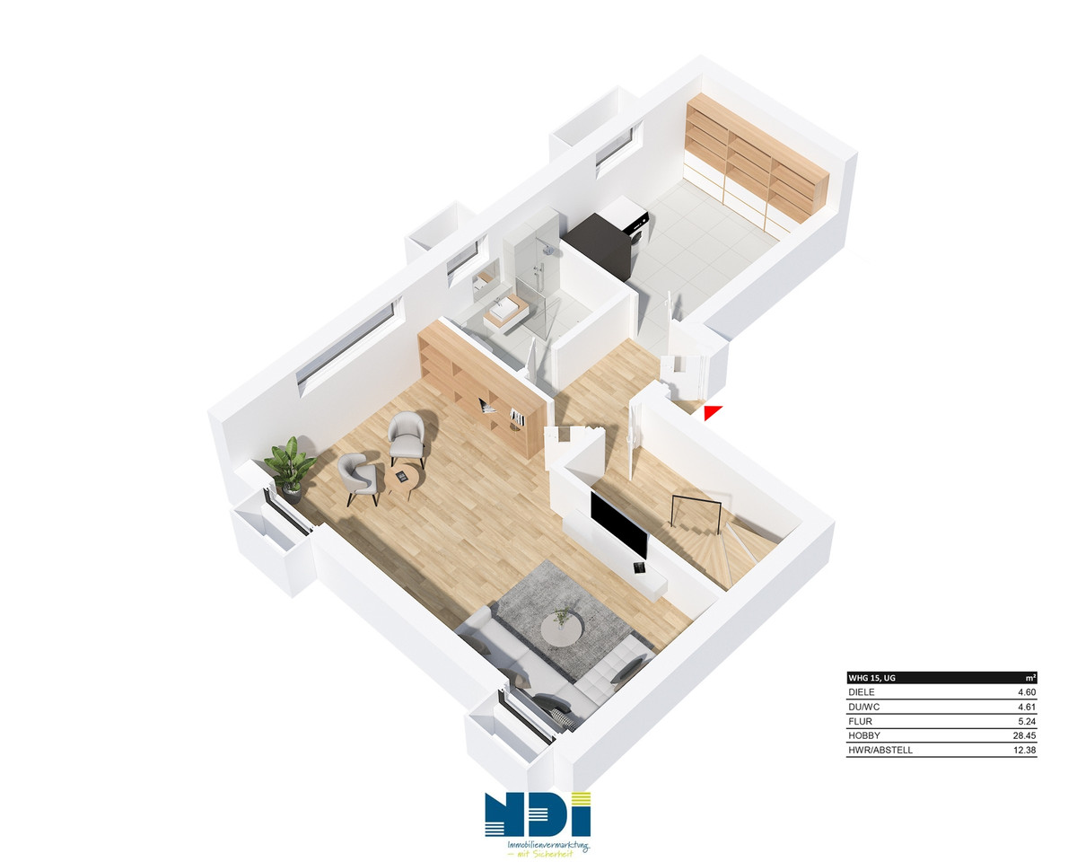 Über eine Treppe gelangen Sie auf die zweite Ebene dieser Wohnung im Untergeschoss, die auch über einen separaten Eingang im Treppenhaus zu erreichen ist.