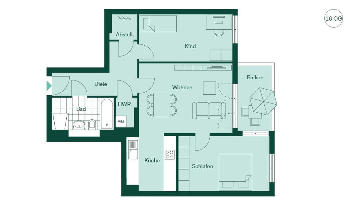 Der offene Wohn- und Essbereich mit angrenzendem Balkon, ein modernes Bad mit bodengleicher Dusche und Badewanne und praktischer Hauswirtschaftsraum mit Waschmaschinenanschluss sorgen für viel Komfort. Zusätzliches Plus im neuen Quartier ist der große Hofgarten, der zum Verweilen und Spielen einlädt.